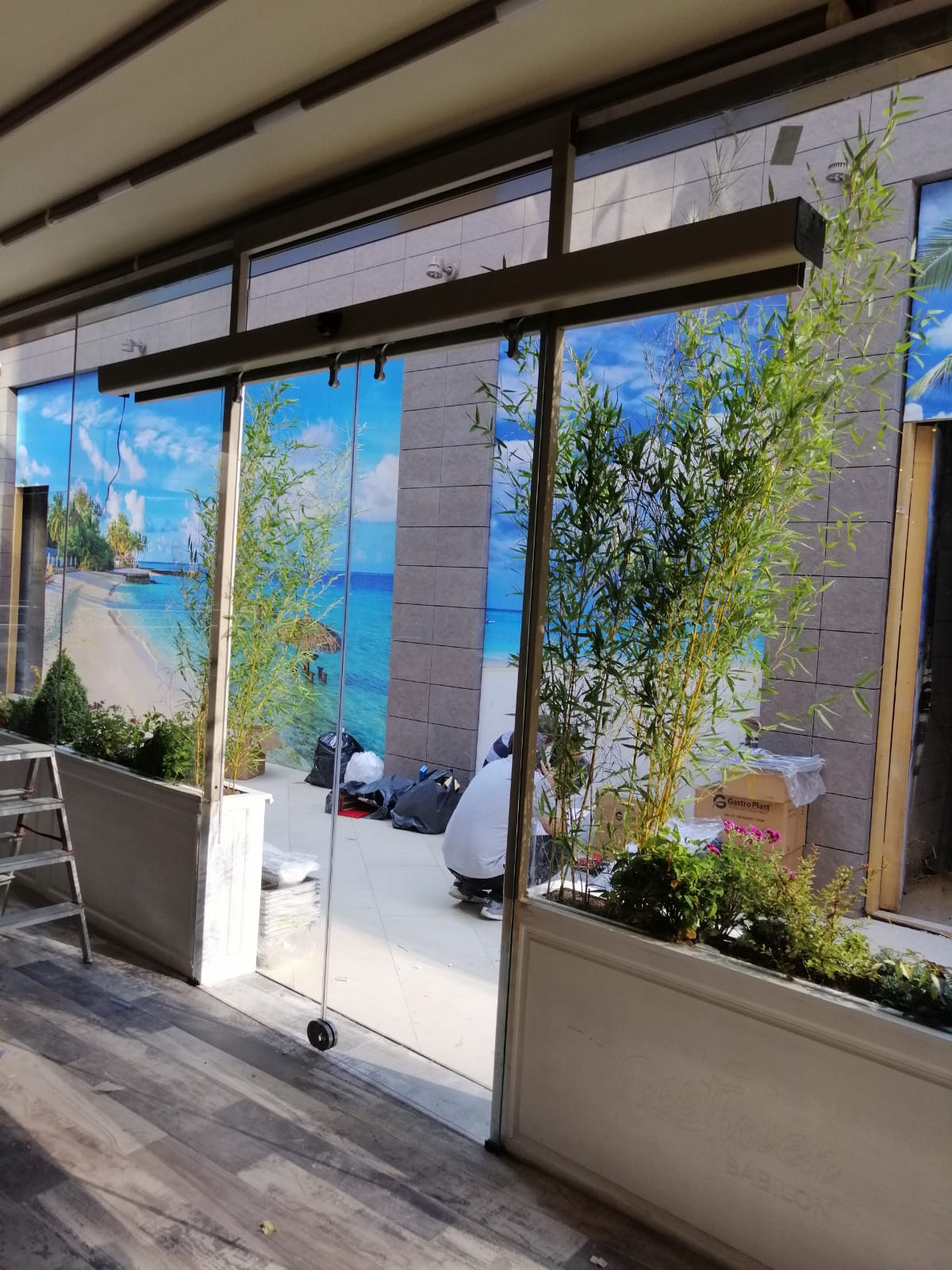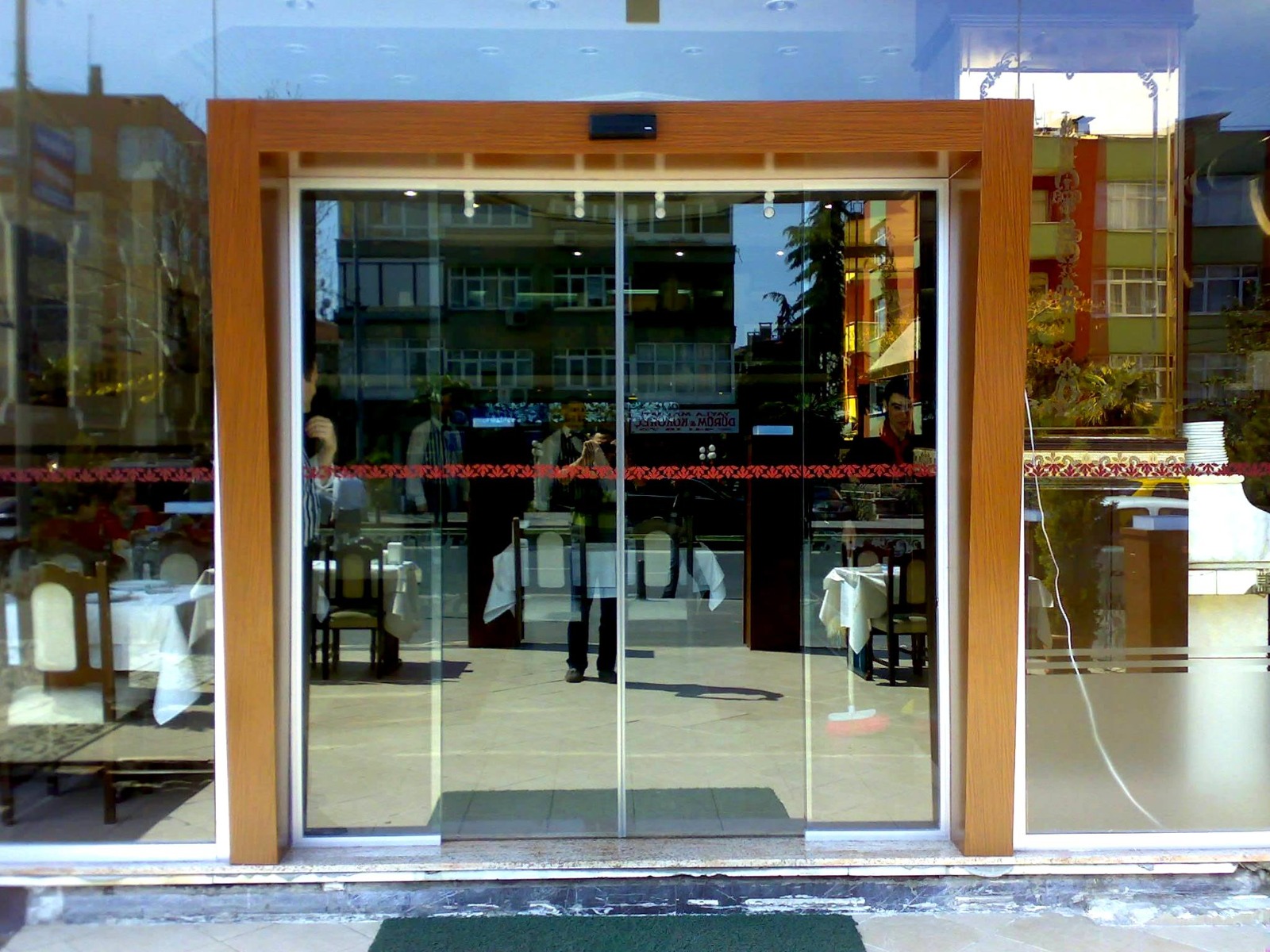 These are automatic sliding doors that require maximum transparency for aesthetic reasons. They are manufactured with a special suspended (manet) structure that holds the glass panel or by suspending the glass from above with a special profile.