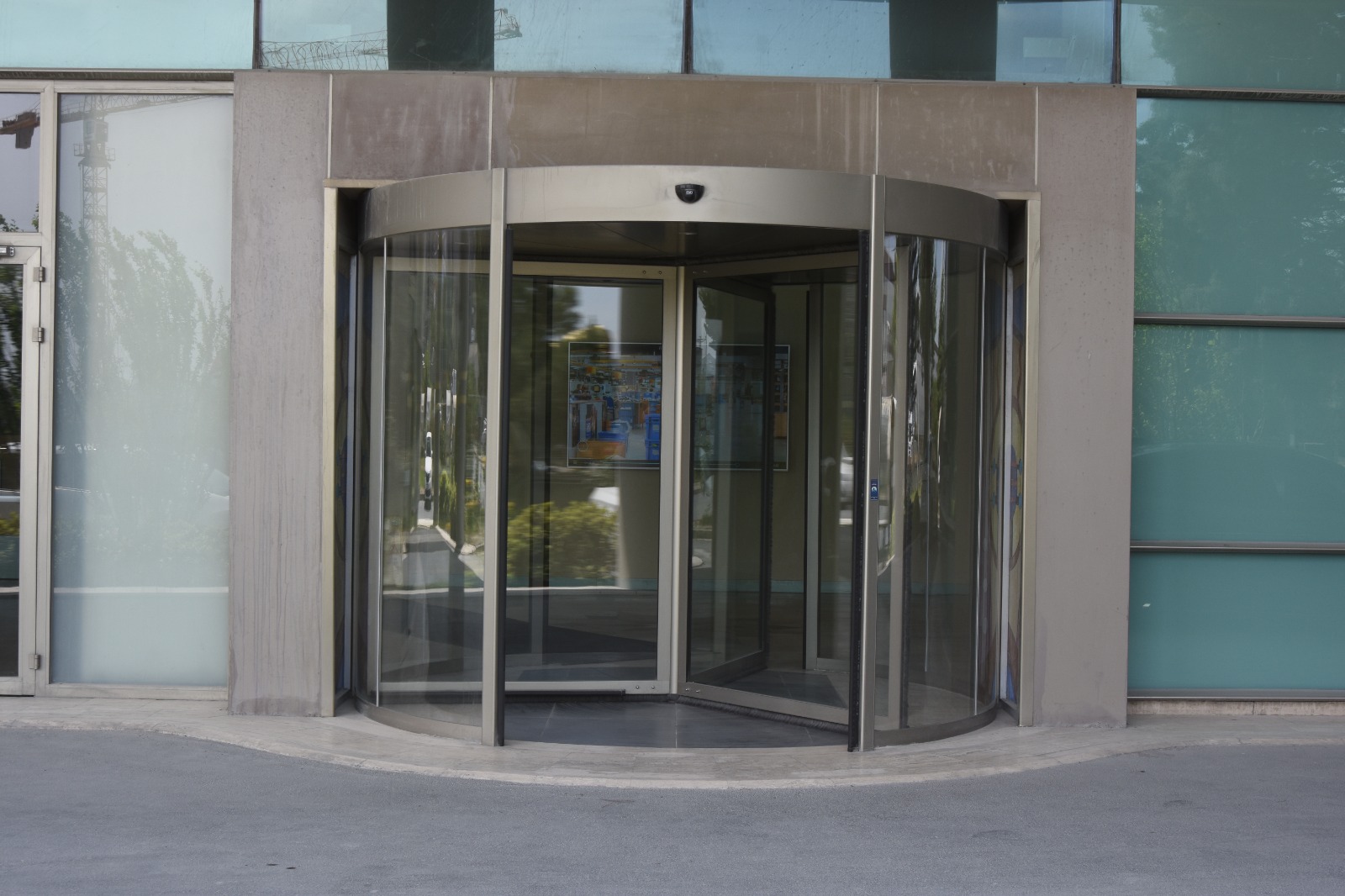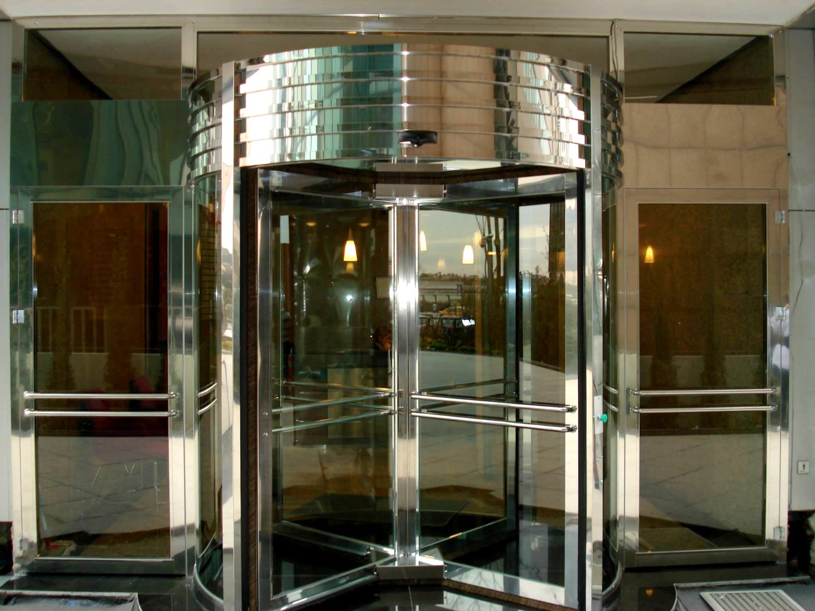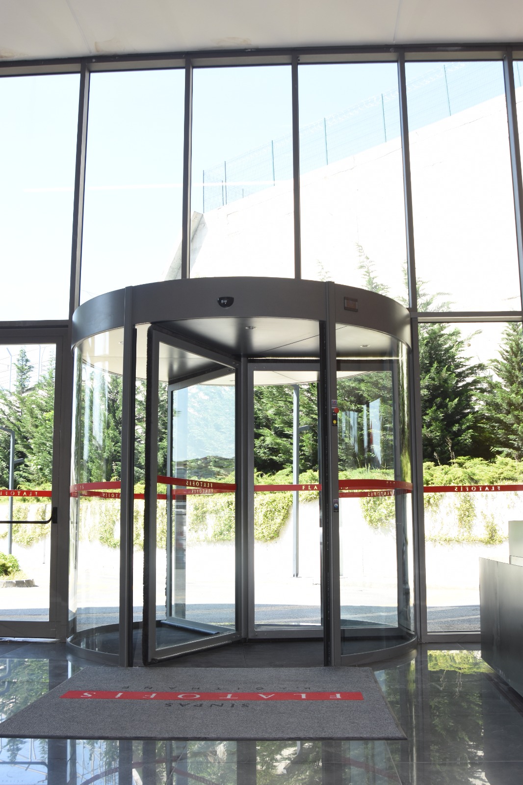 To provide protection inside the door, pneumatic systems are horizontally mounted on the lower sections of the revolving door leaves