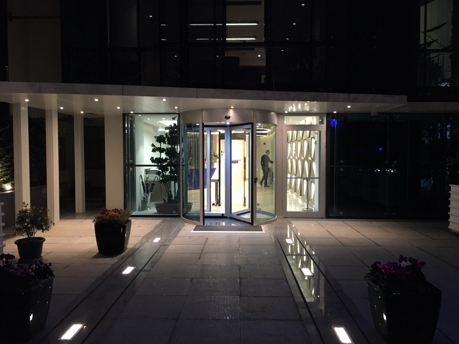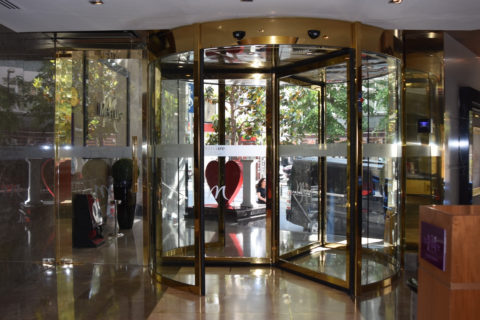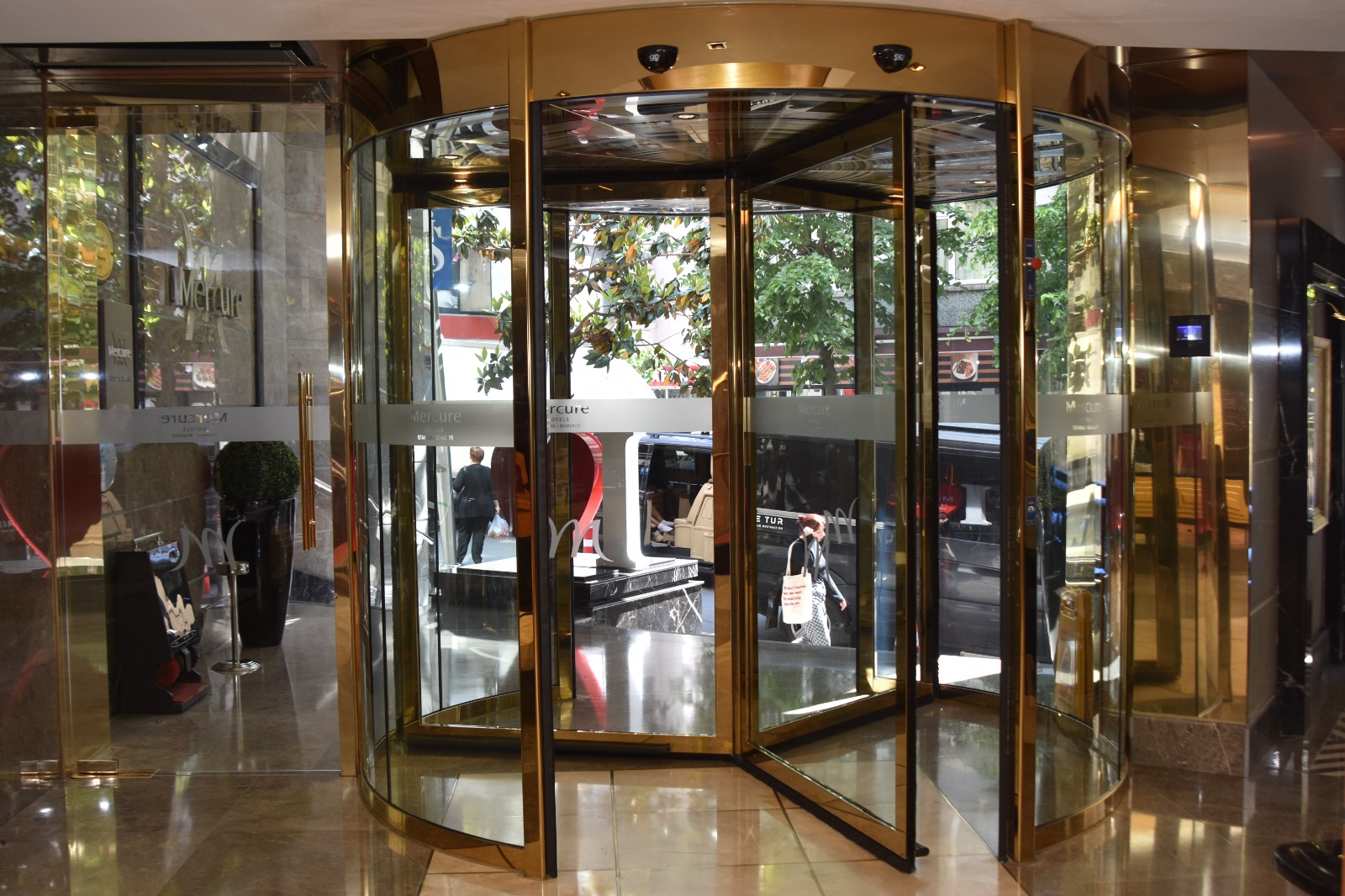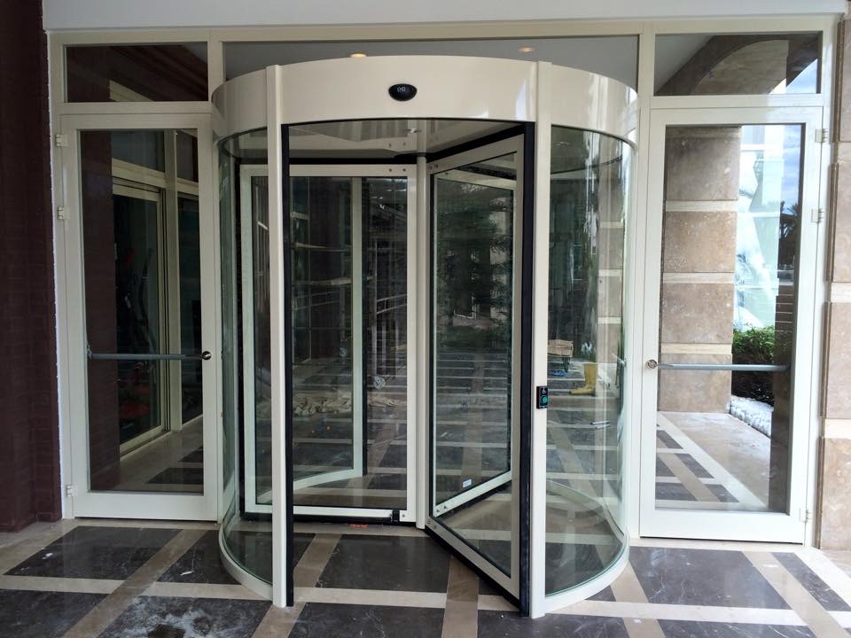 To provide protection inside the door, pneumatic systems are horizontally mounted on the lower sections of the revolving door leaves